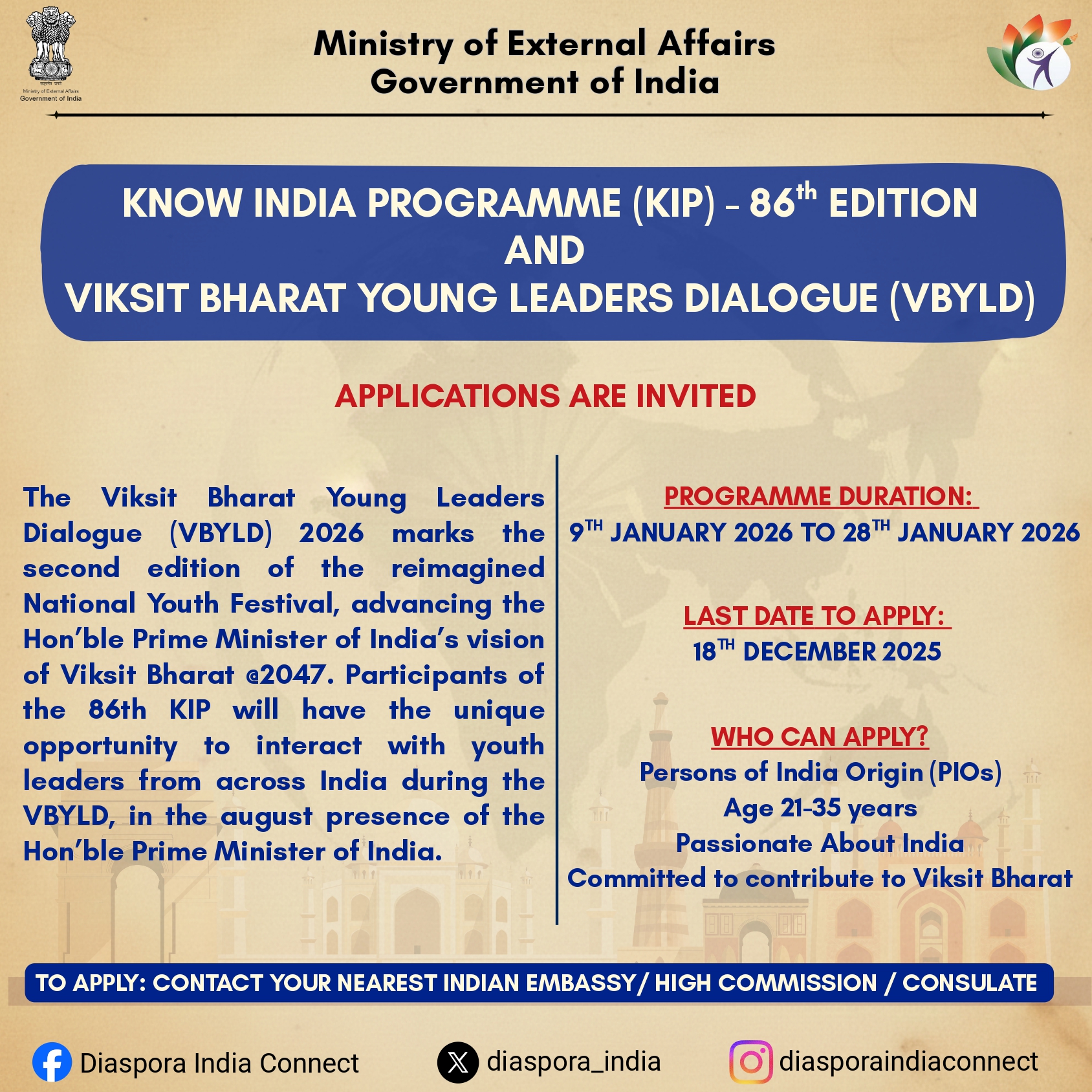 The upcoming 86th Know India Programme is set to be a special and unmissable edition — offering young members of the Indian diaspora (21–35 years) an immersive journey into India’s heritage, culture, innovation ecosystem, and national development priorities. #diaspora #diasporaindiaconnect