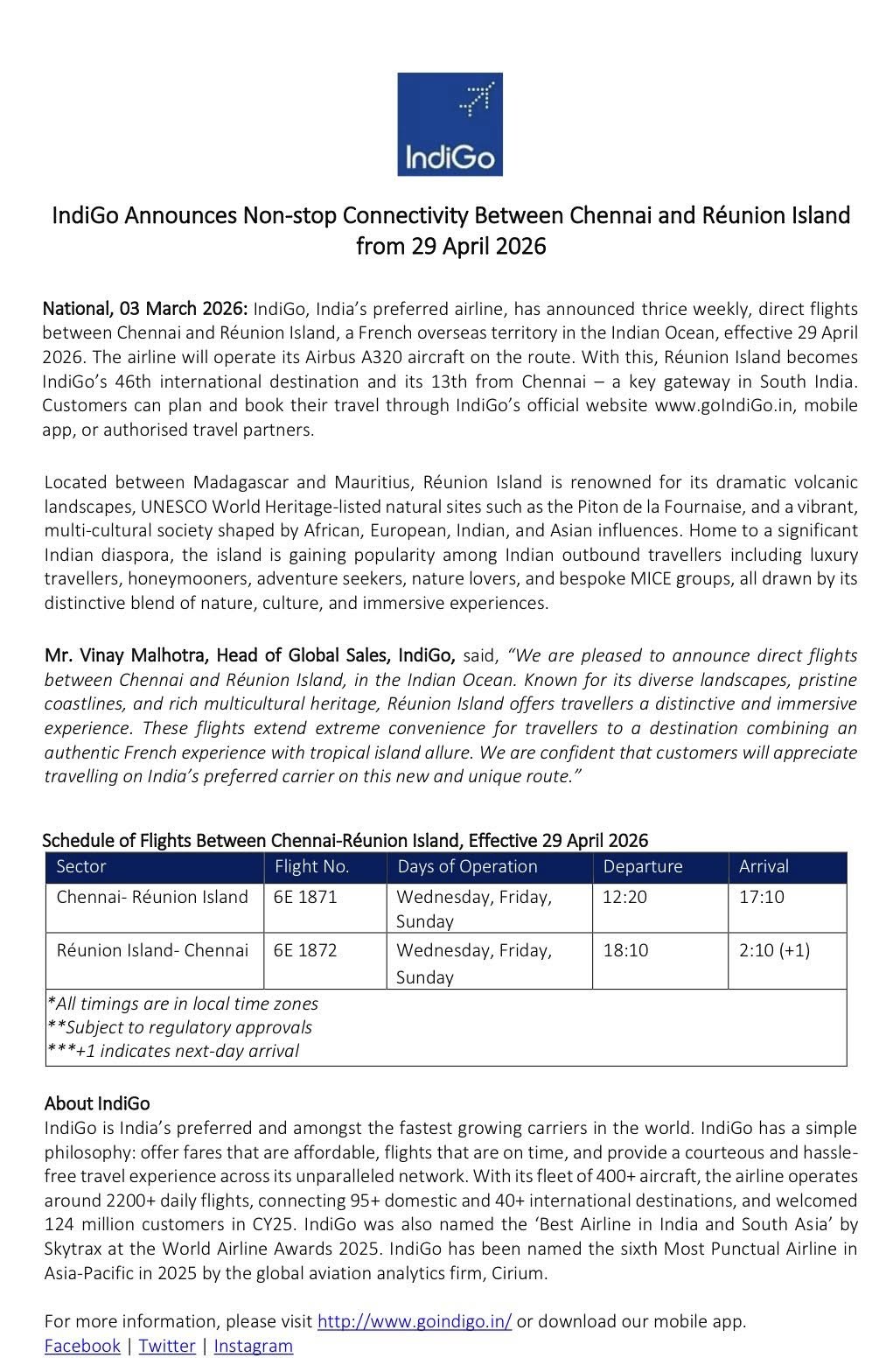 IndiGo announces a new direct connection between Chennai and La Réunion starting 29 April 2026.