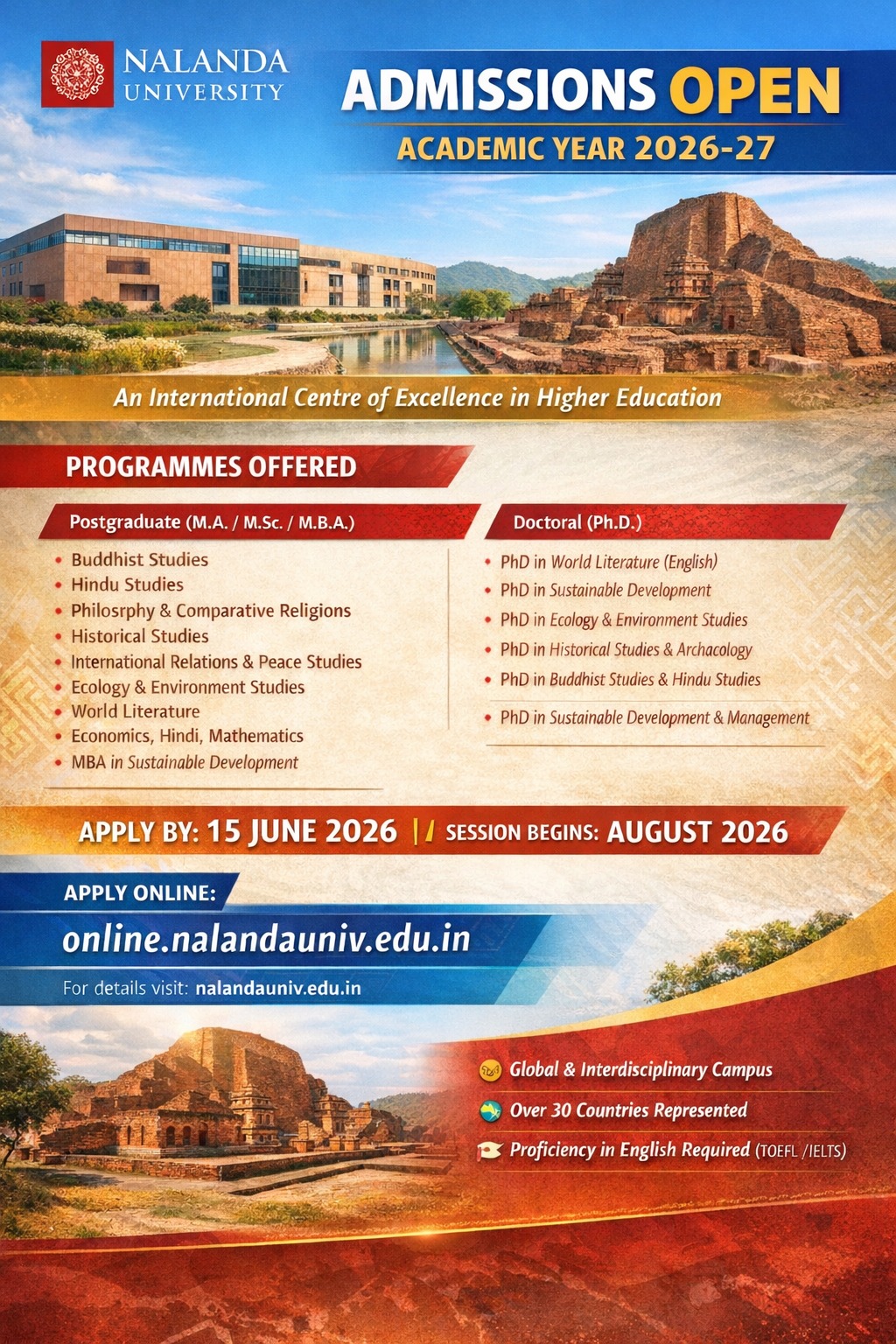 Applications are now open for Master’s and Doctoral programmes at Nalanda University, an international centre of excellence located in Rajgir, Bihar, India.