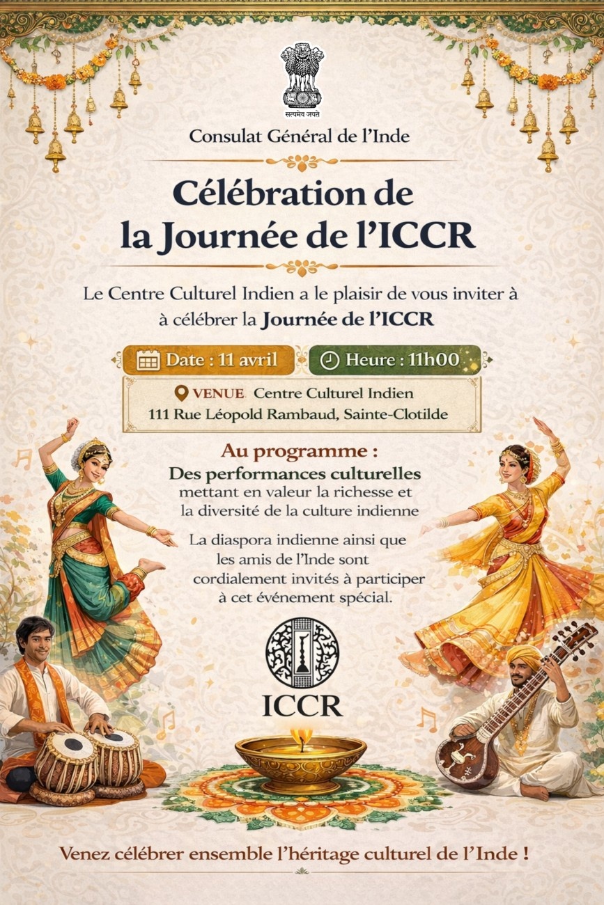 The Consulate General of India cordially invites the Indian diaspora and friends of India to the Celebration of ICCR Day on 11 April at 11h00 at the Indian Cultural Center, Consulate general of India, 111 Rue Léopold Rambaud, Sainte-Clotilde.